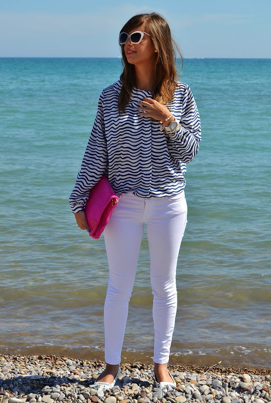 Oggi vi mostro un look di stile marinaio, nel quale sopra una base bianca ho aggiunto una blusa a strisce e, per rompere con il binomio bianco-blu, un clutch fucsia.